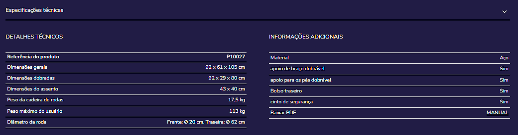 AUTOPROPULSADA: A Cadeira de rodas manual P10027 foi projetada para ser autopropulsionada pelo utilizador através das rodas traseiras de grande diâmetro, ou por outra pessoa utilizando os punhos. É destinada a pessoas com problemas de mobilidade.